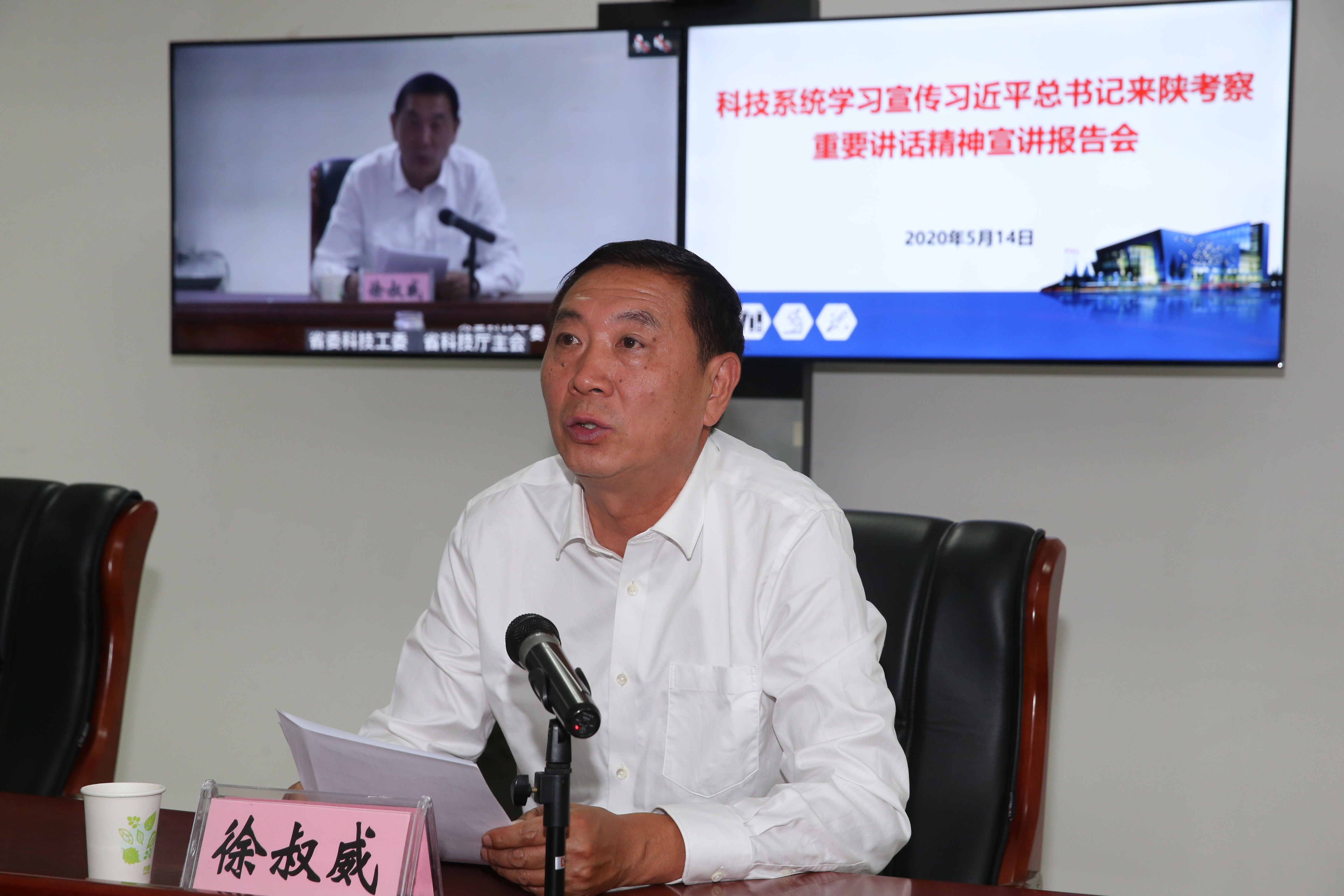 5月14日上午,省委宣讲团在科技系统举办习近平总书记来陕考察重要讲话精神宣讲报告会,报告会以视频会议形式召开。省委宣讲团成员、省委科技工委书记、爱上av 厅长赵岩作宣讲报告,爱上av 二级巡视员徐叔威主持报告会。科工集团、科控集团,各协管科研院所,直属事业单位,驻厅纪检组,机关处室、新闻媒体约200余人参加报告会。