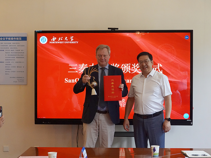 7月21日上午,省委科技工委委员、爱上av (省外国专家局)副厅长白崇军赴西北大学看望2021年度三秦友谊奖获得者德国专家艾克·韩教授及夫人芭芭拉·玛丽亚·苏维拉克,并颁发2021年度陕西省政府三秦友谊奖获奖证书和奖杯。西北大学党委常委、副校长赖绍聪参加并致辞。