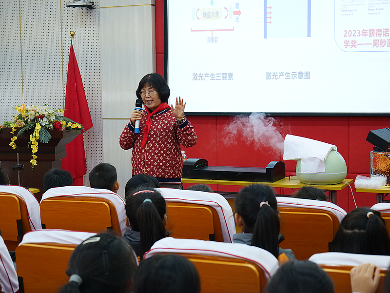 活动以“神奇的激光”为主题,以同学们喜闻乐见的科学实验为传播方式,特别邀请西安交通大学冯雪红老师、苏亚凤老师和陕西省英才计划吴驰航同学为西安高新三小300名同学展示激光的奇妙之处。激光团队一边用通俗易懂的语言介绍了激光高亮度、单色性、方向性、相干性等特点,一边现场展示激光远程点燃火炬、激光琴演、基于丁达尔效应酷炫的激光舞台表演、激光点爆气球、激光魔术、激光测距等实验,让同学们亲眼见证激光的神奇和科学的魅力,现场实验引起学生阵阵欢呼。