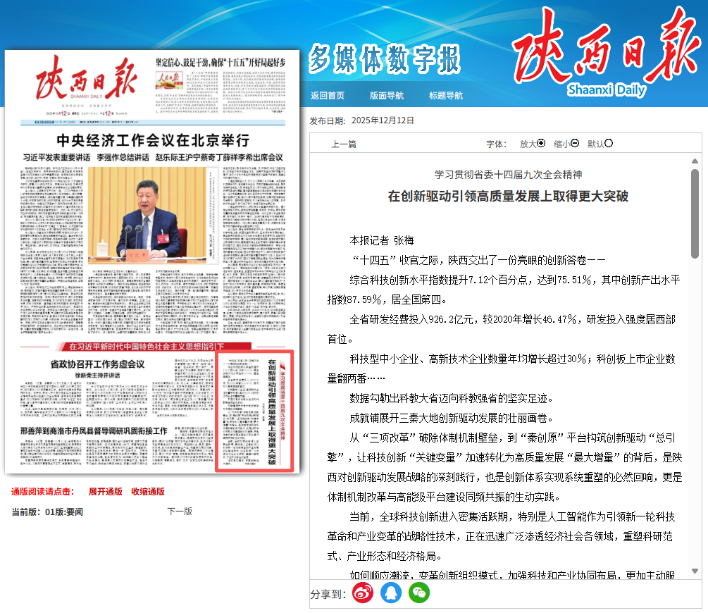 站在“十五五”开局的历史关口,陕西正以更加坚定的创新胆识、更加务实的实干担当,将创新基因融入血脉、化为行动,引领发展新质生产力,为加快高水平科技自立自强贡献坚实的陕西力量!