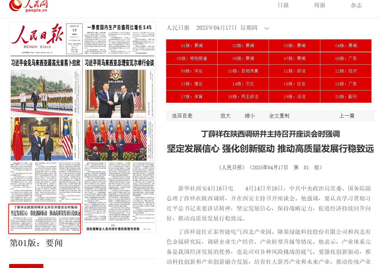 丁薛祥前往正泰智能电气西北产业园、隆基绿能科技股份有限公司和西北有色金属研究院,调研企业生产经营、产业转型升级等情况。他表示,产业体系完备是我国经济发展的优势,也是应对各种风险挑战的底气。要强化创新驱动,推动科技创新和产业创新融合发展,培育壮大新兴产业和未来产业,推动传统产业改造提升,加快建设现代化产业体系。维护公平有序市场秩序,防止“内卷式”竞争。支持新型研究机构发展,加强应用基础研究和产业共性技术研发,为产业发展提供有力支撑。