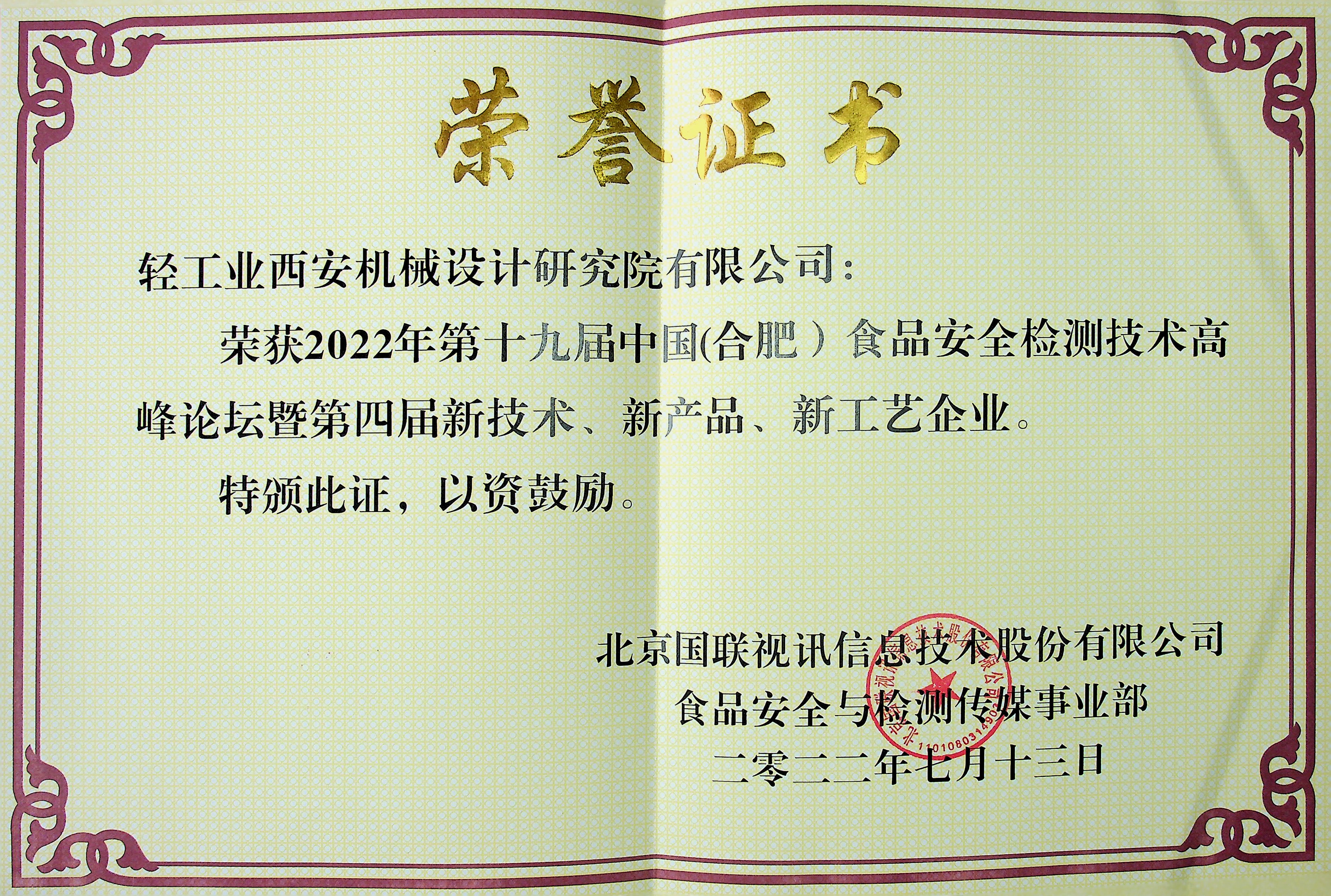 西安轻机院在此次评选活动中荣获“2022年第十九届中国(合肥)食品安全检测技术高峰论坛暨第四届新技术、新产品、新工艺企业”称号。